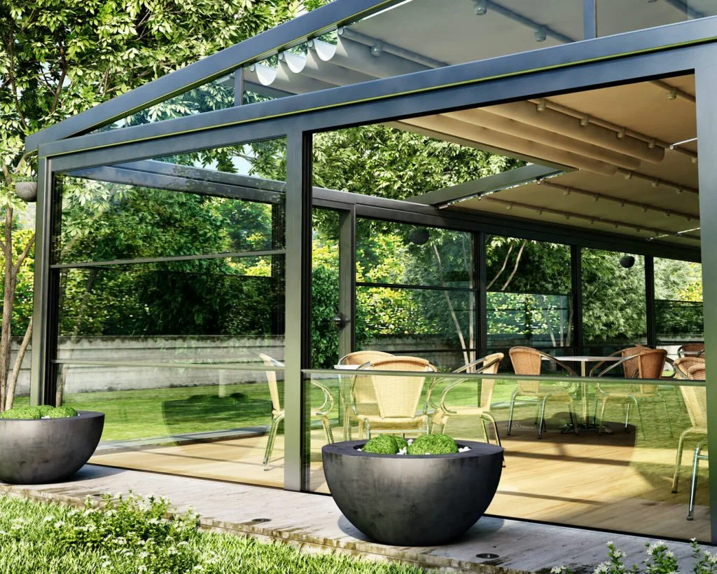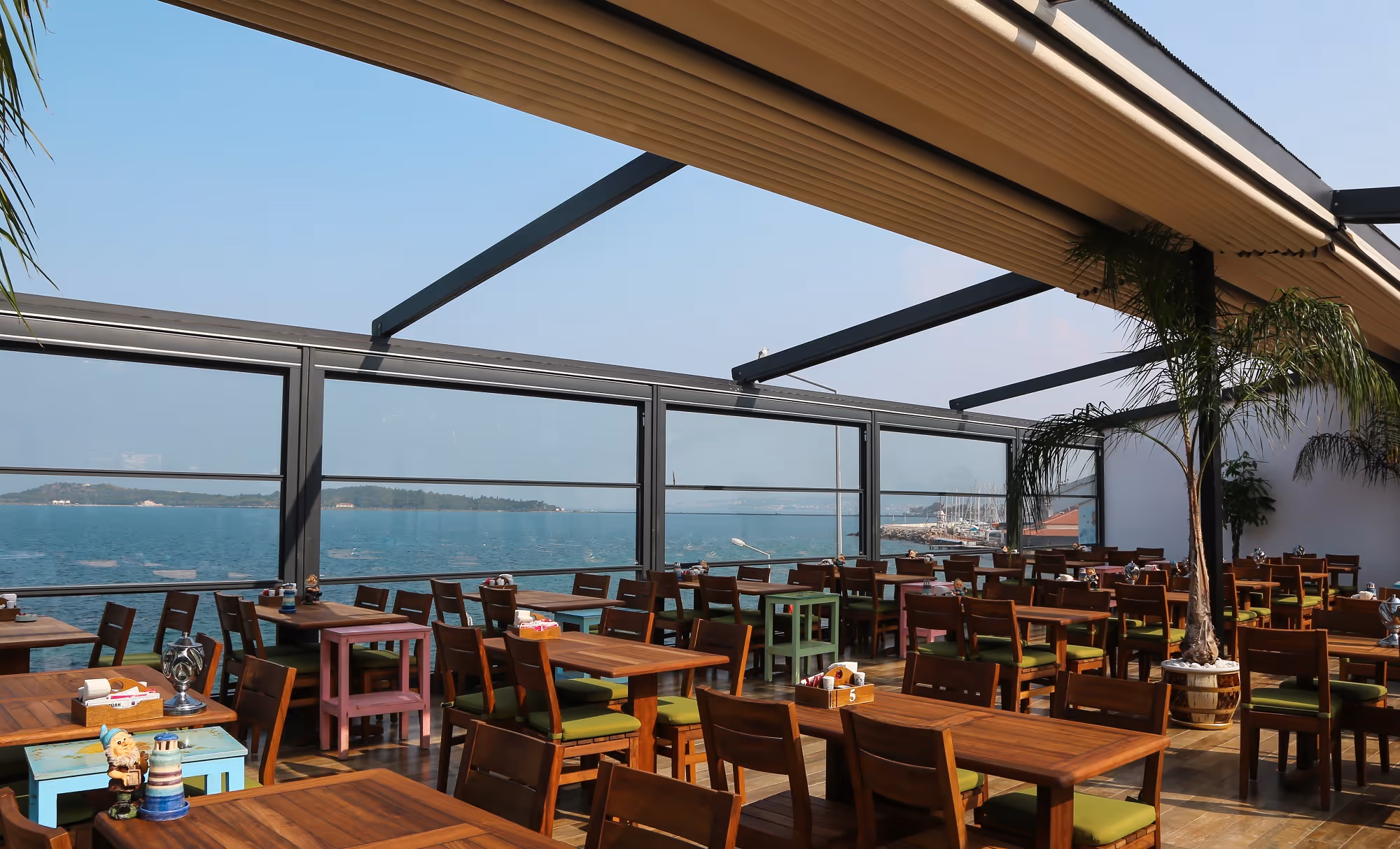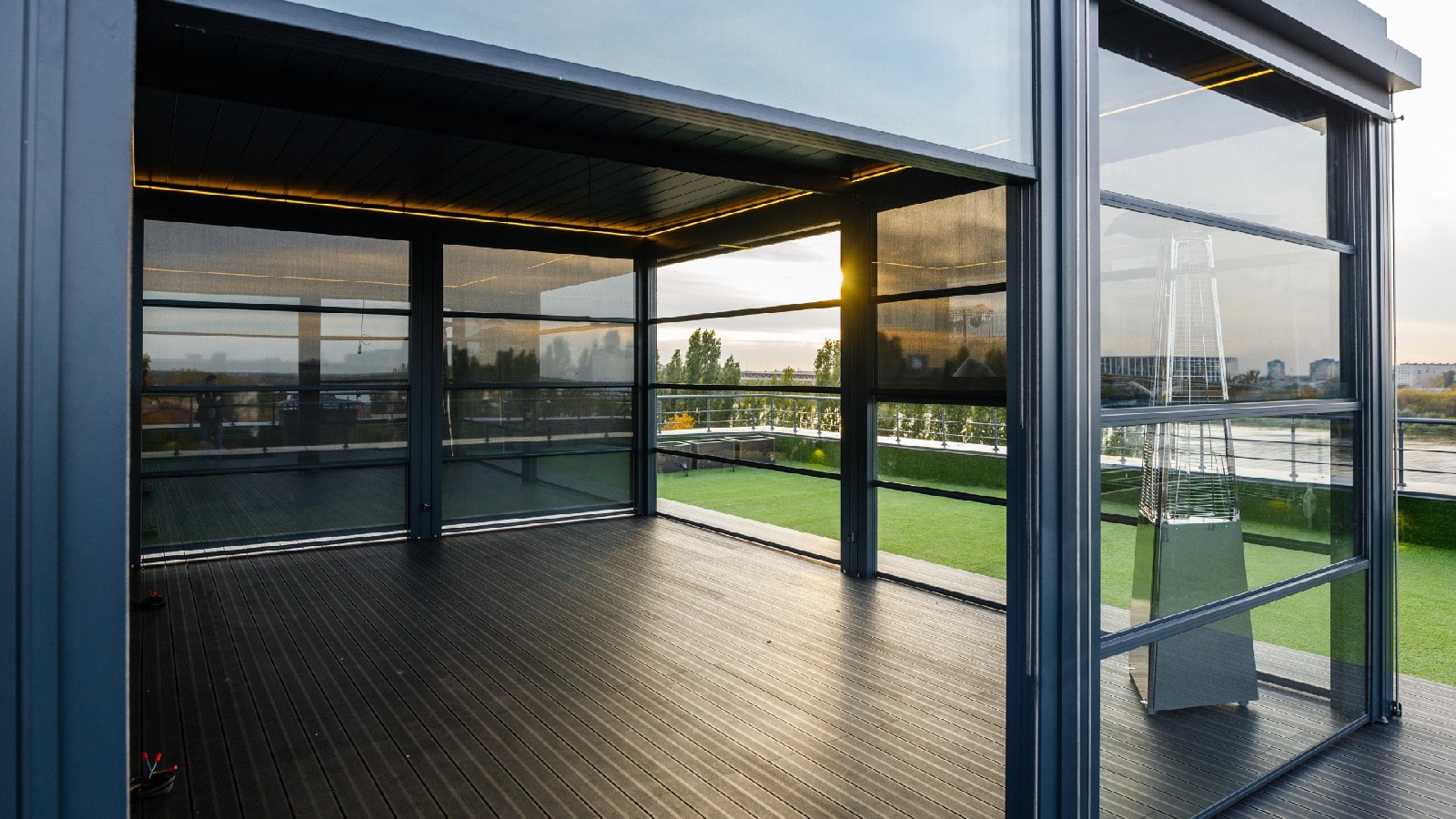 Это раздвижные оконные системы для вертикального остекления помещений, которое обеспечивает регулировку притока воздуха и деления помещения на зоны. И всё это выглядит очень эффектно!